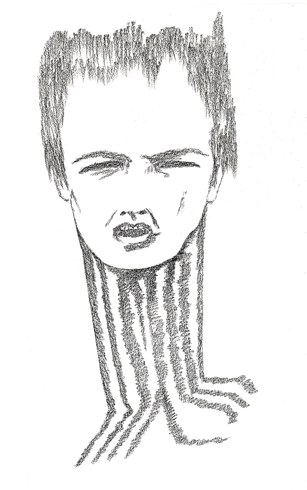 The strain of shouting the news has opened his mouth to such a degree that his lower lip (to the left) has burst; white on white, light is spilling out though the crack.