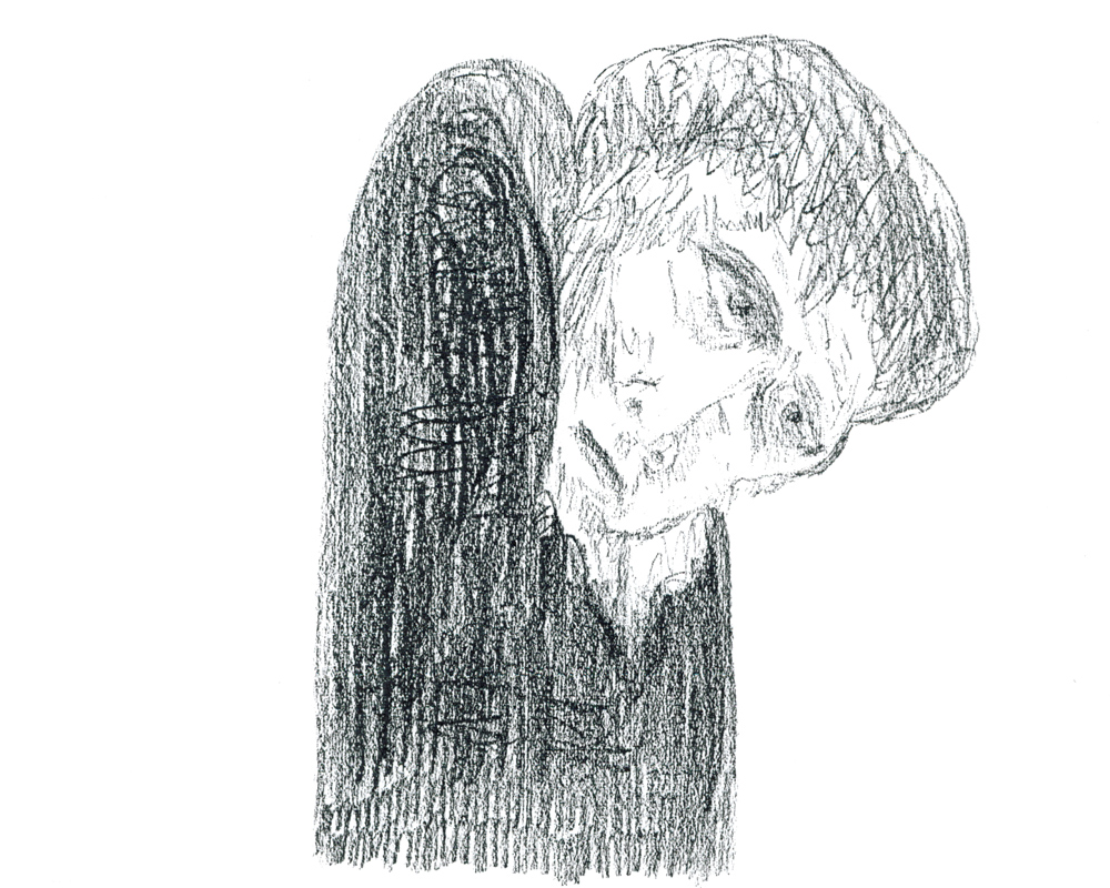 The prisoner of an aged body whose spine has become decalcified and weak. Her head, attached to a rigid torso, slumps downward. In profile she resembles a vertical coffin.